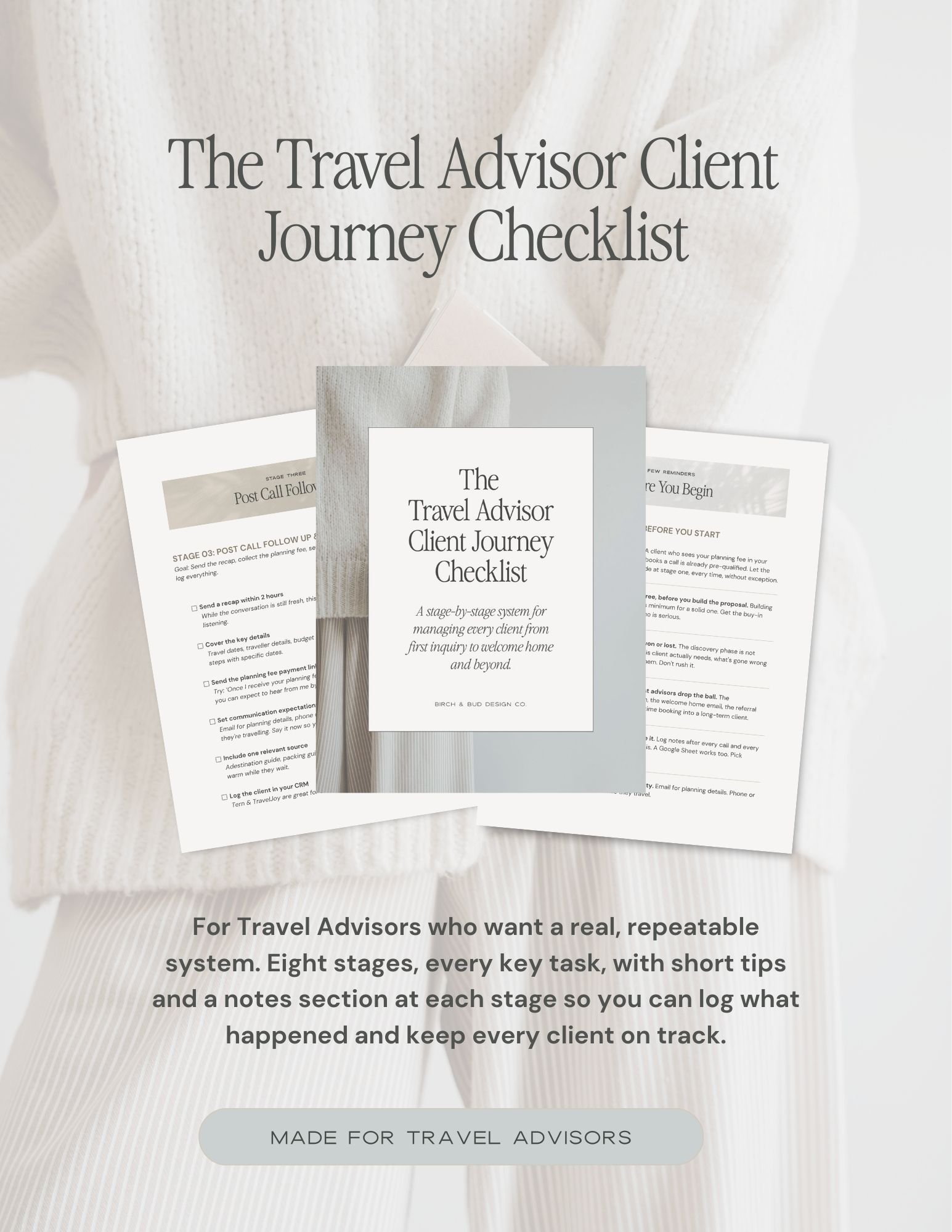Designed for travel advisors who want a real system, not a list of vague reminders. It walks you through every stage of the client journey from first inquiry to building your referral pipeline. Eight stages, every key task, with short tips and a notes section at each stage so you can log what happened and keep every client experience on track.