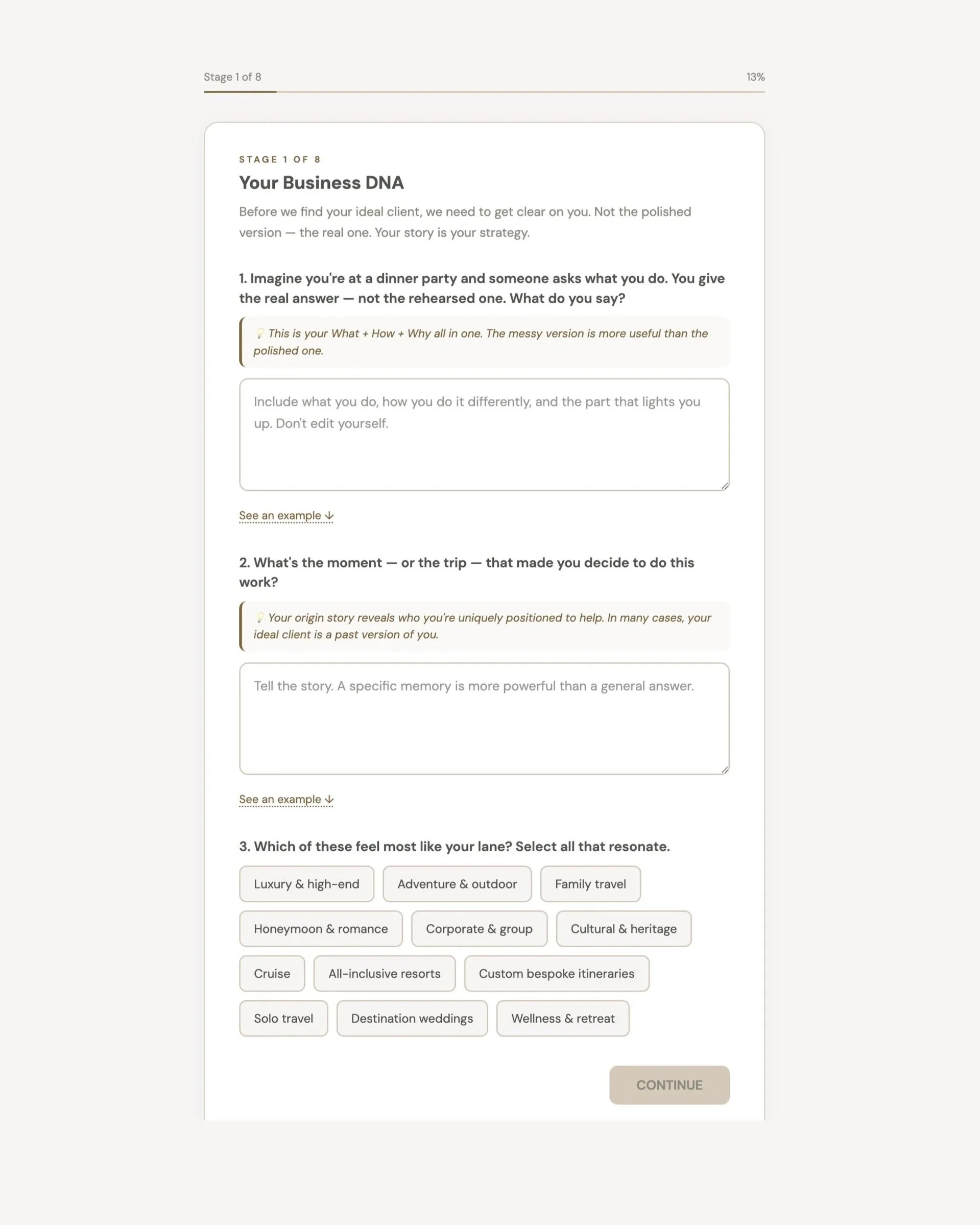 Once complete, you'll get a unique AI-generated client portrait, messaging strategy, 12 social content prompts, and a shareable client brief created entirely from your answers, not pre-determined client profiles.