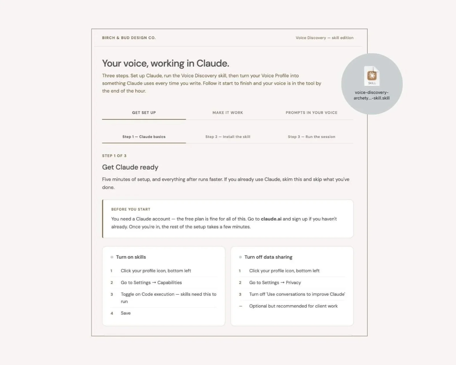 The dashboard walks you through enabling skills in Claude, uploading the skill file, running the 20- 45 minute Voice Discovery session, and setting up your voice to work automatically going forward. Start to finish, about an hour.